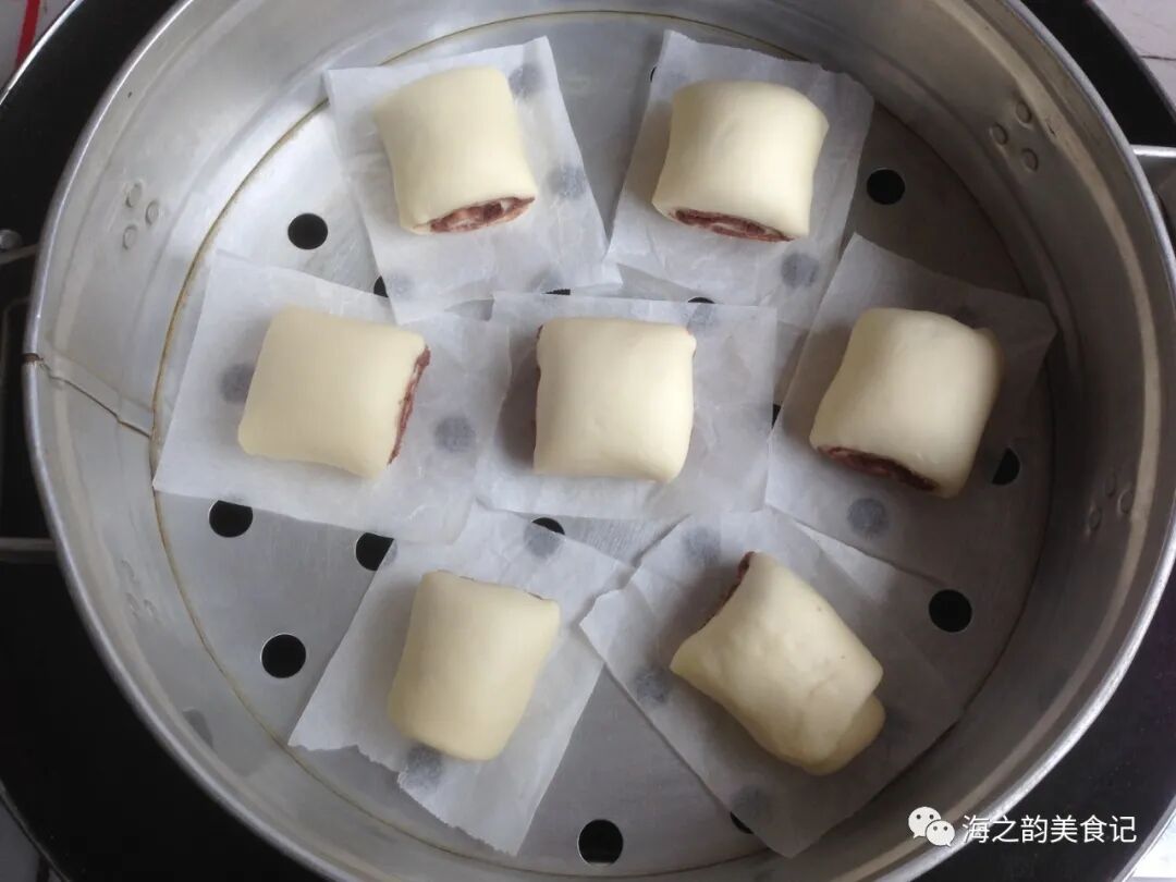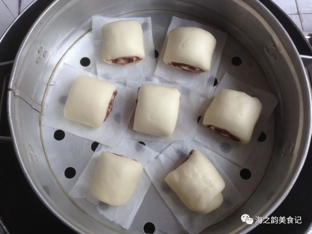 8、冷水上锅蒸,大火烧开后转中火蒸13分钟左右,蒸好后关火,继续焖3-5分钟再揭锅盖。蒸好的豆沙卷如果还未食用的话,可以在放凉后放保鲜袋中,放入冰箱冷冻层保存,第二天再隔水蒸几分钟就可以了。