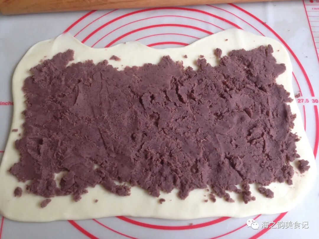 4、发酵好的面团取出,放在案板上揉面团排气,揉几分钟,揉至面团光滑,切面没有大气孔,这样蒸出来才光滑。如果面团有点粘手,可以在案板上撒点面粉。将面团擀成长方形,四个角擀开,收口处压薄一些,注意:面皮不要擀太薄。将豆沙馅均匀抹在面皮上面,收口处不要放豆沙馅。