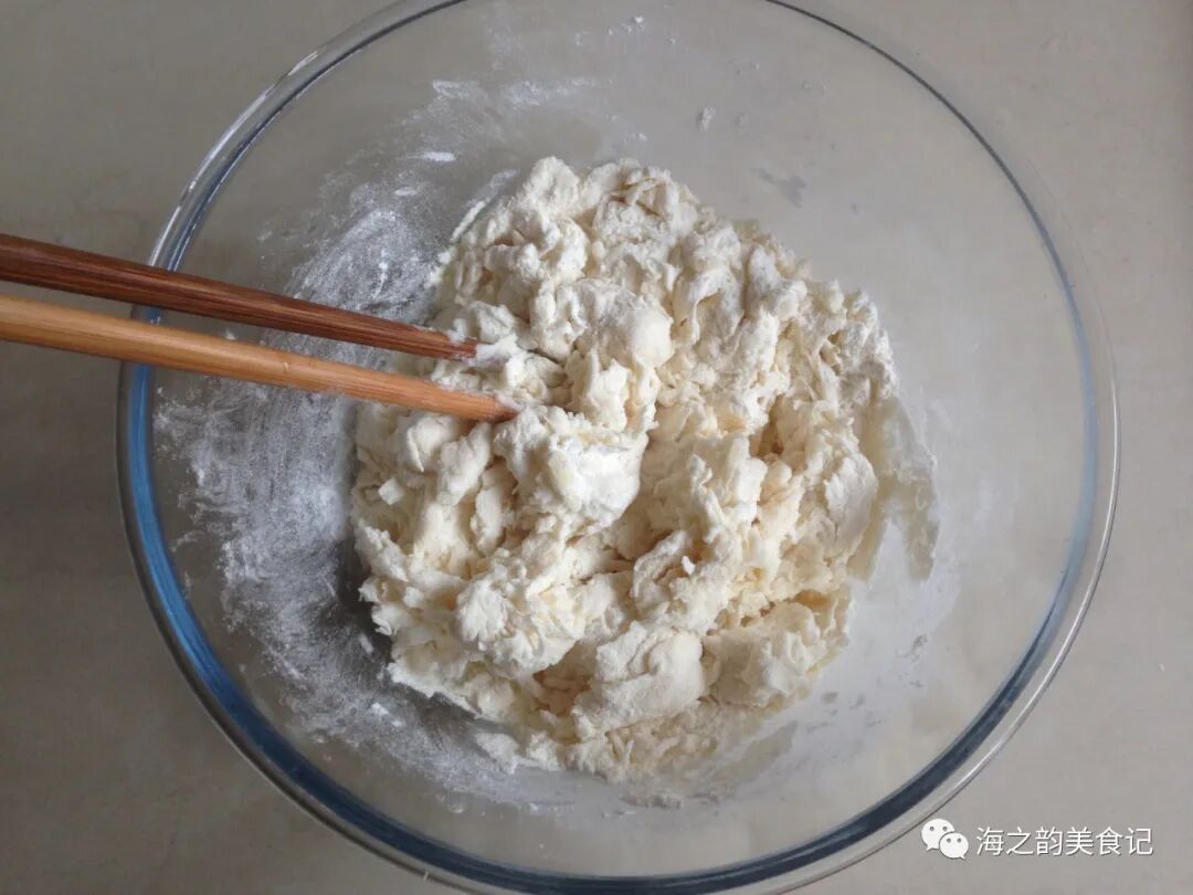 1、酵母和糖溶于温水中,搅拌溶解。把面粉和奶粉倒入,用筷子将面粉搅拌成絮状,面团不要和得太软。
