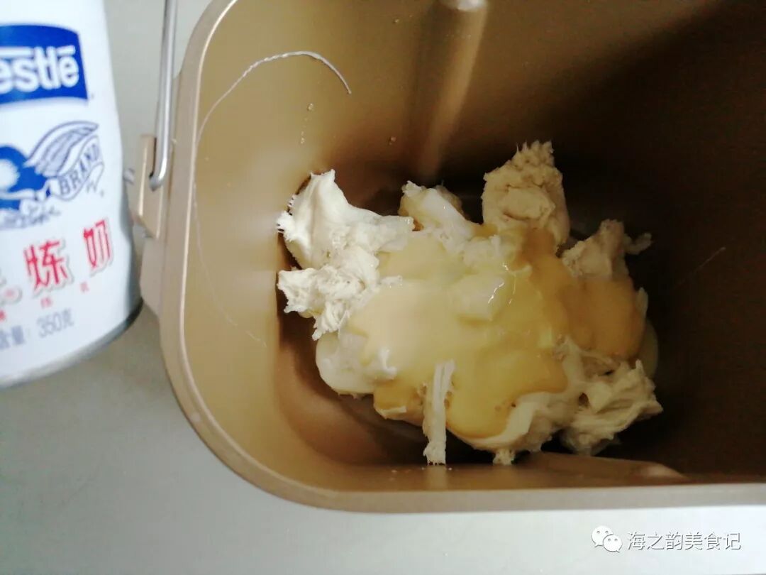 主面团:新良焙食尚面包粉90克,水26克,鸡蛋液30克,炼奶45克,盐4克,耐高糖酵母0.5克,黄油22克