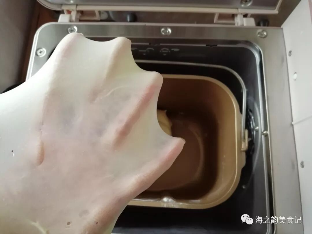 5、继续揉面18分钟,揉至扩展阶段即可。将面团留在面包机里,发酵30-40分钟左右。