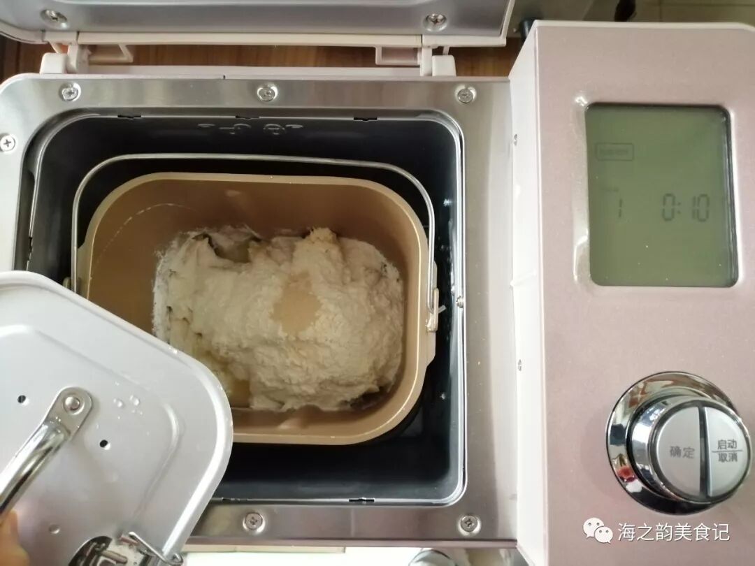 3、倒入面粉和酵母,将面包桶放入到东菱JD08面包机里,盖上面包桶盖子,选择和面程序10分钟(不同型号的面包机揉面时间不同)。