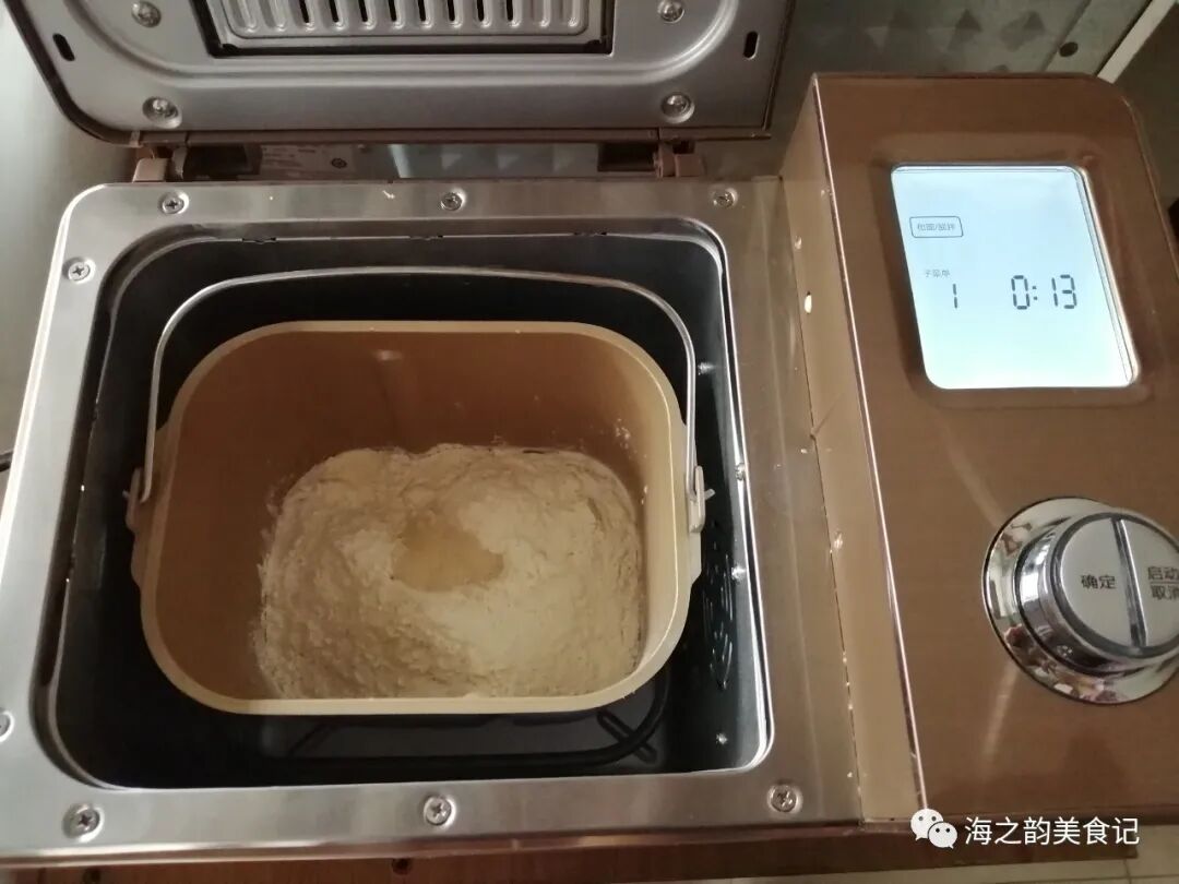 3、再倒入面粉,在面粉顶端加入酵母,把面包桶放入到东菱面包机里,选择和面程序13分钟。面包机的默认和面时间是10分钟,可以加时间的。