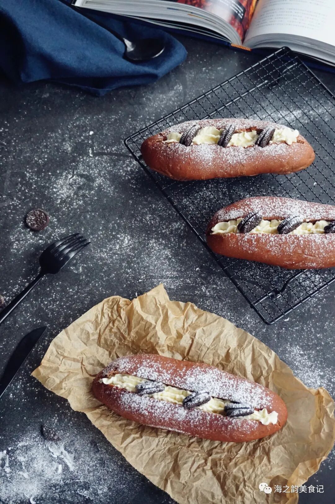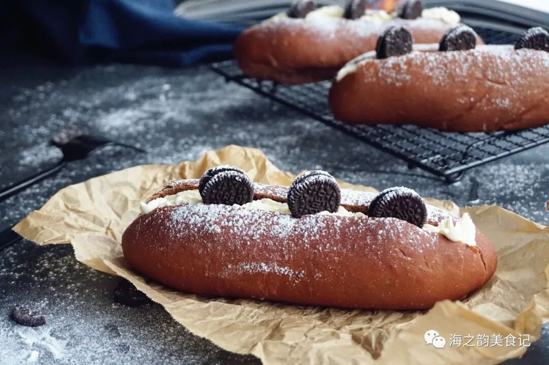 8、面包做好后,取出晾凉,用面包刀在面包上方中间切开,淡奶油加糖隔冰水打发,装进裱花袋,将奶油挤在切口里面,放上奥利奥小饼干,最后撒上糖霜即可。打发淡奶油也要在空调房下操作哟!