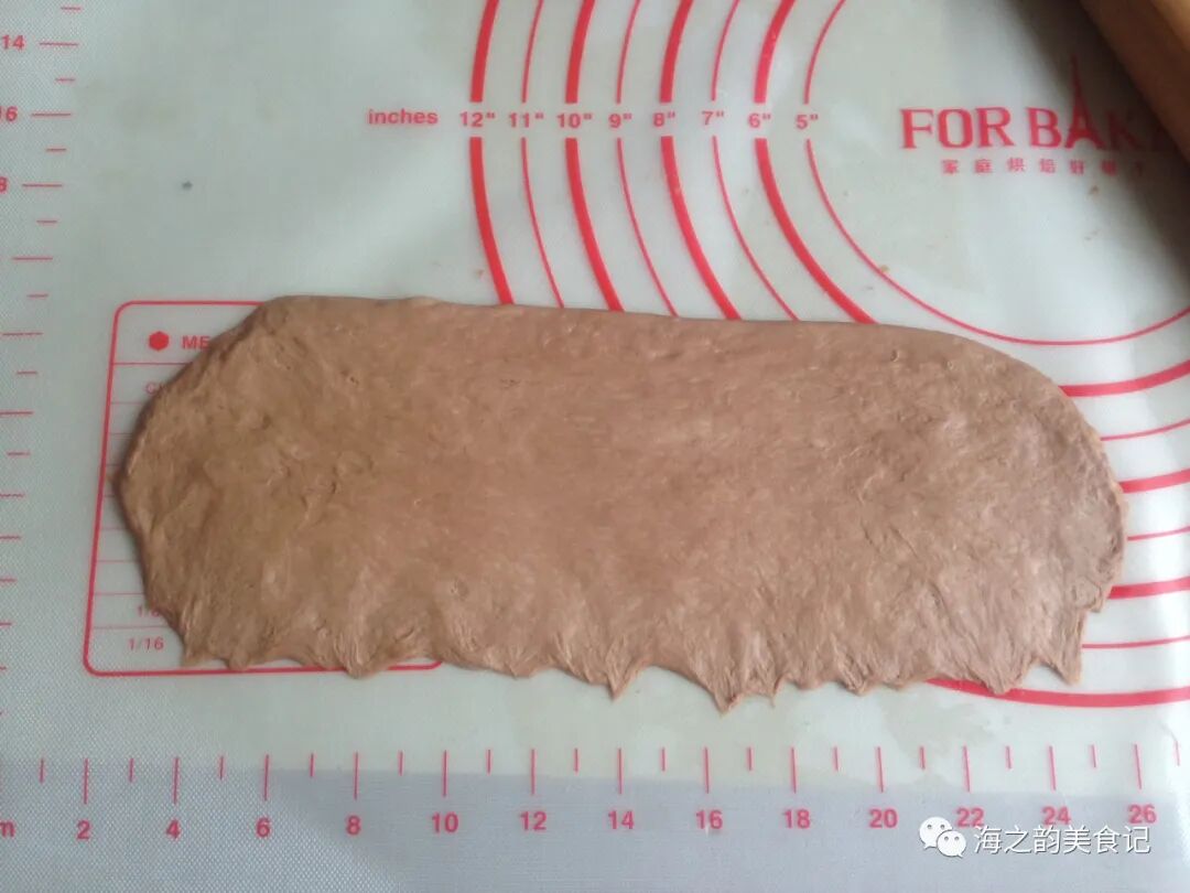 6、从上往下卷起,放在烤盘上。面包胚放入烤箱内,选择发酵档35度,发酵两倍大(发酵时在烤箱内放置一碗温水,增加湿度)。