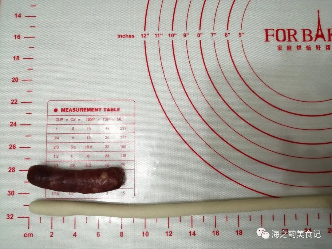 4、把小面团搓长,我用的肠仔长度是8CM,小面团搓到32CM,4倍的长度。