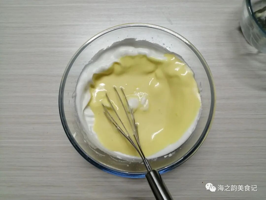 5、把拌好的蛋糕糊倒入到剩余的蛋白霜里,用同样的手法拌匀,最后再用刮刀把盆壁和盆底的也拌匀。