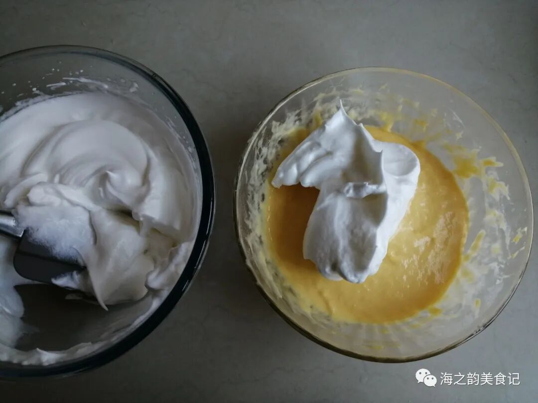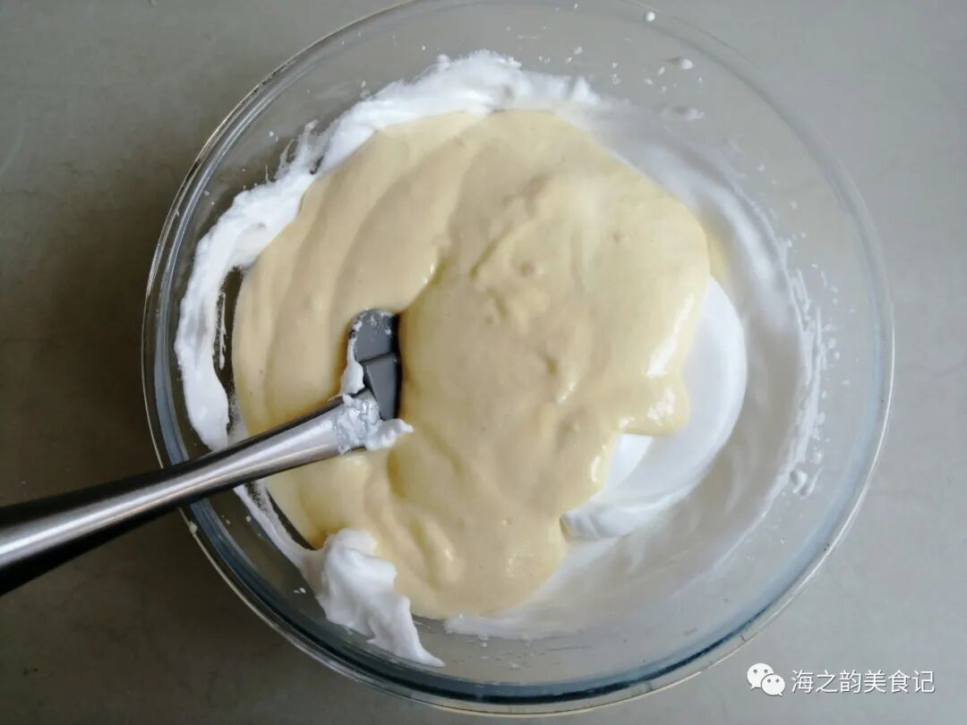 5、取1/3已经打发好的蛋白霜到蛋黄糊里,用蛋抽划J字拌匀,左手逆时针转动打蛋盆。