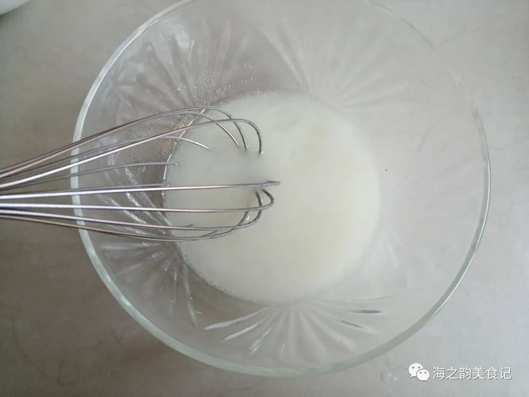 4、冷冻过的蛋清滴入几滴柠檬汁,细砂糖分三次加入进去,用电动打蛋器打至偏干性发泡的蛋白霜。