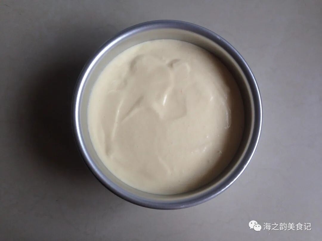 7、蛋糕糊在离模具(6寸活底阳极模具)20CM正上方倒入,在桌面上震两下,震出大气泡。