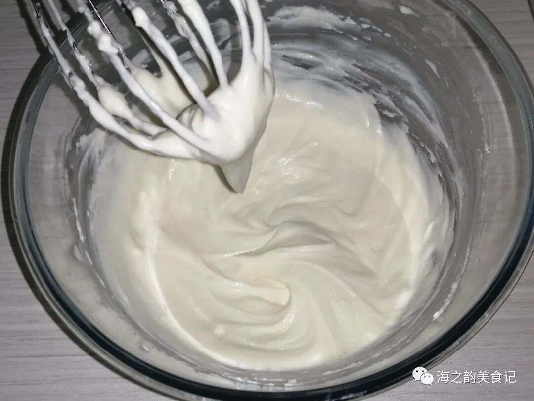 9、做冰乳酪酱,奶油奶酪解冻拌顺滑。淡奶油加糖隔冰水打至5分发,有点流动的状态。把奶油奶酪倒入,拌至顺滑。