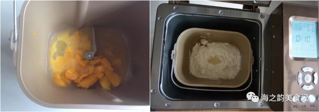 1、面包桶里加入水、芒果肉、蛋液、糖和盐。