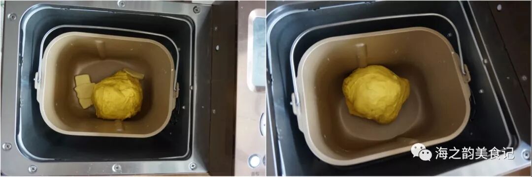 3、在第一次和面结束后,加入切成小块的黄油,选择和面12分钟。