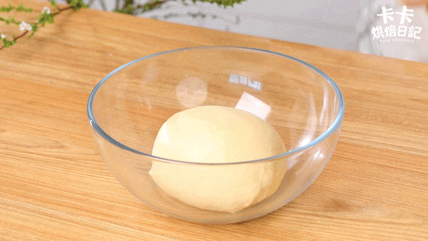3、面团起缸收圆(面团起缸温度在26-28℃为最佳),盖上保鲜膜放在28℃,湿度75%的环境,大概发酵一小时,至2~2.5倍大,手粘粉戳面团不回缩不塌陷即可