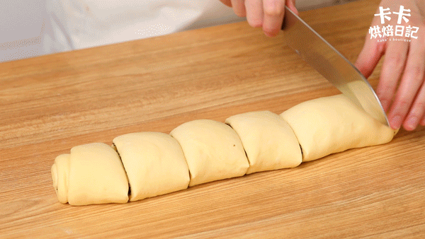 6、面团条平均切成6段,放在铺有油布的烤盘上,送入烤箱,32℃发酵60分钟至1.5倍大