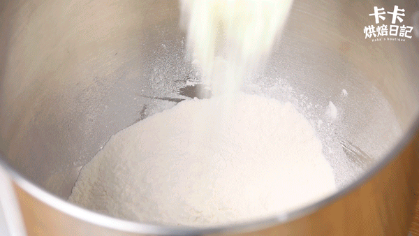 1、面团材料中,除黄油和盐以外,其他材料全部放入打面缸里