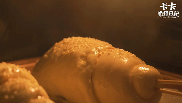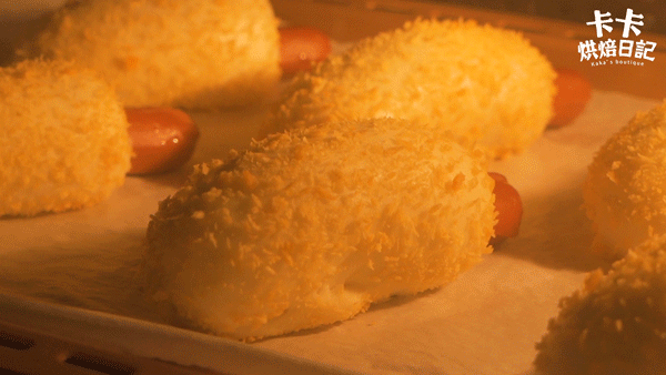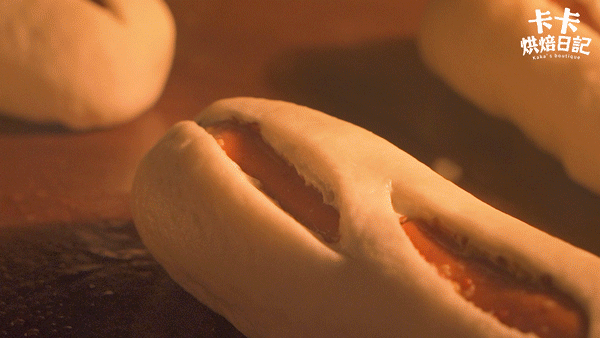 看着面包体膨胀变胖,火腿肠舒展开来,像开花一样绽放,就知道面包要烤好了。