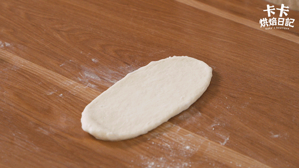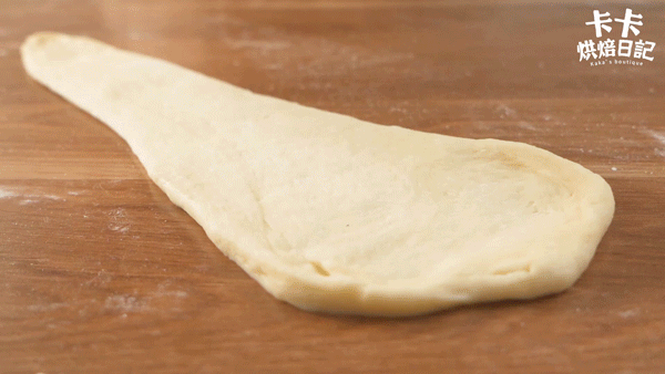 然后准备一个90g的面团轻拍排气,擀成15cm左右长的牛舌状。