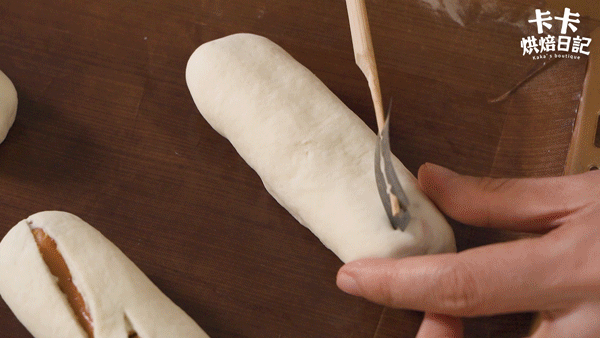 封口朝下,放入铺有油纸的烤盆中,用割包刀在面团上竖划两刀