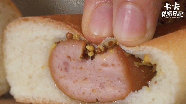 抹上芥末籽酱,放上一条肠仔,捏紧封口。