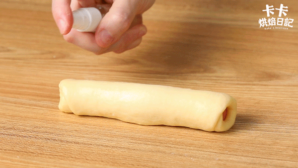面团部分,只需准备一份基础的面团,发酵完铺开擀长,翻面压边,放上热狗肠,卷起收口朝下。