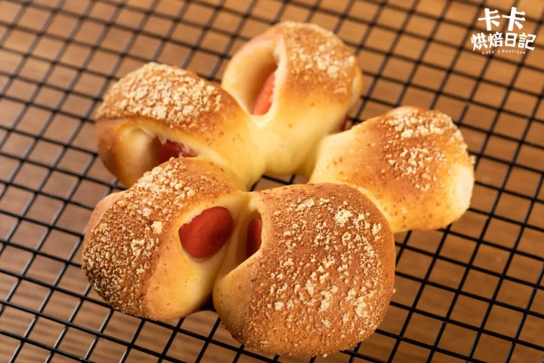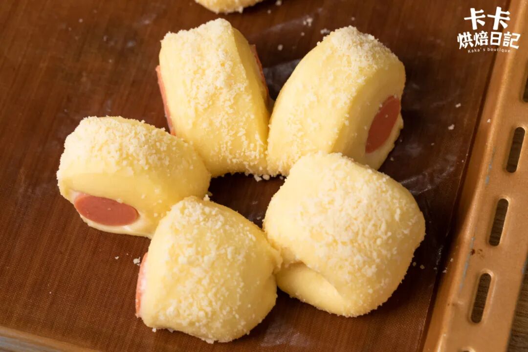 顶部的芝士碎烤好后咸香酥脆,给肠仔包的口感锦上添花~