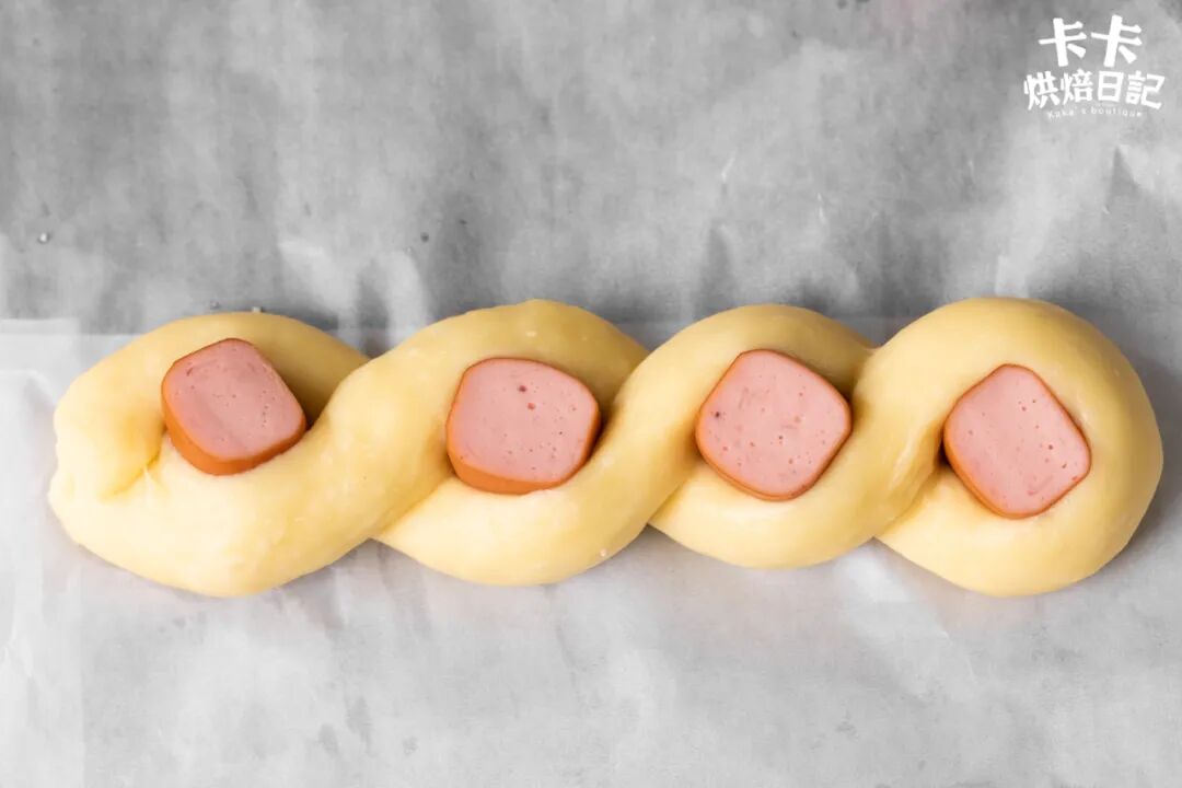 只需要把面团搓出长条,分成两半,绕着香肠块交织编织即可。