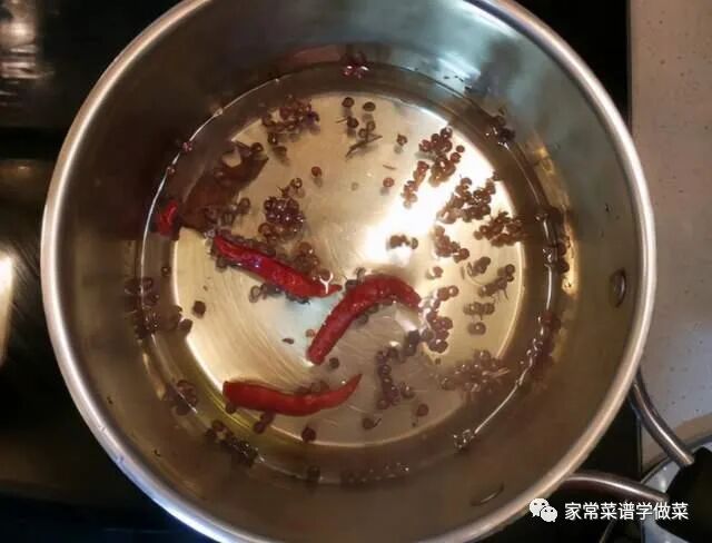 第四步,凉油放入冻好的花生米,小火加热,不停翻炒,待花生米的颜色微微泛黄的时候,捞出来,控油,锅中留少许油,待晾凉后,放入一把花椒粒和干辣椒;
