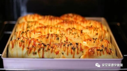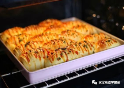 12、最后送入预热好的烤箱中层,上下火160度烤30分钟,中途需要观察面包上色情况,如果面包已经上色到自己满意的程度,则需要加盖锡纸。