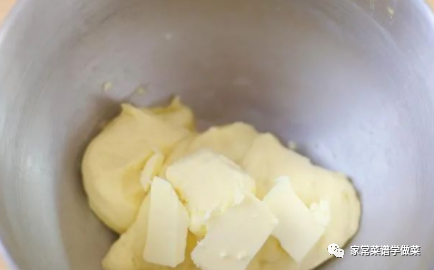 2、13分钟后,加入软化的无盐黄油,继续用4档搅拌。现在天气比较冷,建议黄油提前一晚拿出来适温软化