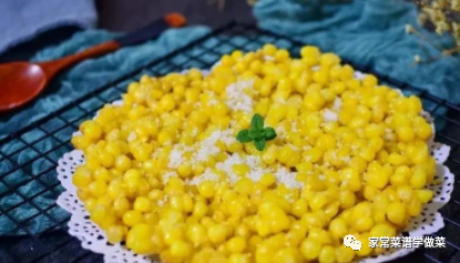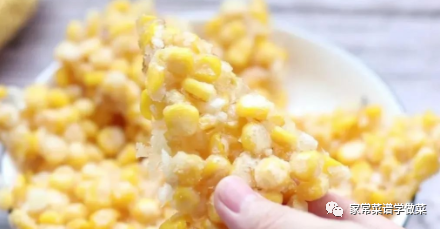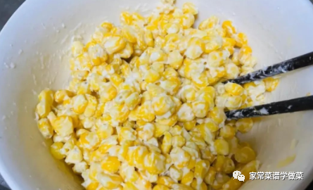 2、煮熟之后,稍微晾凉,直接用刀把玉米粒切下来;然后直接加少许干淀粉拌匀,使每个玉米粒都均匀地黏上淀粉。