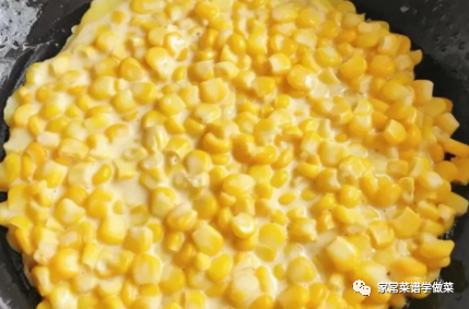 3、热油锅,可以稍微多放一点,把玉米粒均匀地倒进去,用铲子摊平,小火煎3-5分钟,让玉米粒都黏在一起成饼状,定型后再翻面;煎至两面金黄,出锅前撒上一层白砂糖即可。
