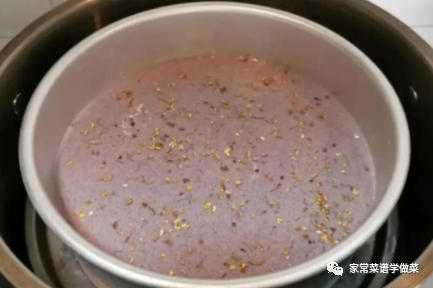 3、发酵好的面浆用筷子搅拌排气;然后直接倒入到提前备好的模具里面,上面撒上自己爱吃的干果或者桂花等等;冷水上锅蒸,上气之后,中火蒸20-25分钟;关火后再焖5分钟,即可出锅。