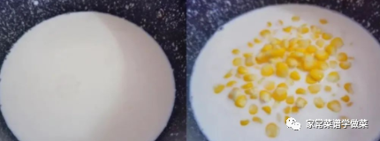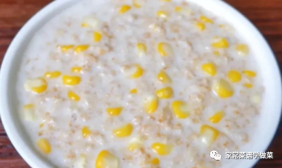 2、另起锅放入少许牛奶小火加热,然后直接把准备好的玉米粒和燕麦直接倒进去,小火炖煮2-3分钟即可出锅。