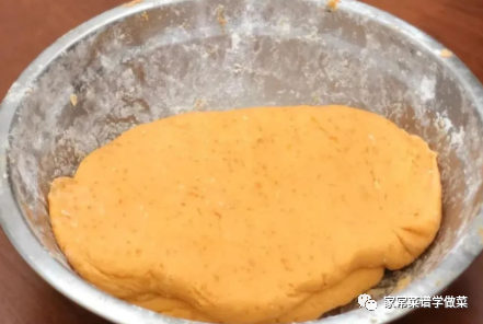 2、蒸熟的红薯,用少许白糖,再用勺子碾成红薯泥,然后将糯米粉少量多次地倒入红薯里面,揉搓成面团,面团中等偏硬即可。