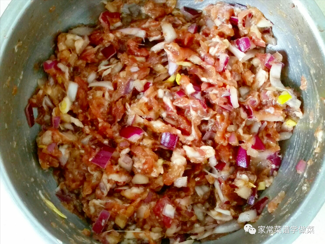 准备一斤猪肉,三分肥七分瘦刚刚好,口感不腻也不柴,猪肉绞成肉馅,加入食盐、蚝油、芝麻香油、生抽、老抽、黑胡椒粉,顺着一个方向搅动,搅拌上劲,洋葱剥掉外皮,切成碎馅,一起混合均匀。