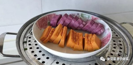 2、紫薯和南瓜去皮,放入蒸锅里面蒸熟。