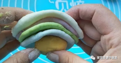 6、选5个不同颜色的小剂子用擀面杖擀成圆形,然后一层一层地叠起来,放在虎口上收口团成馒头造型。