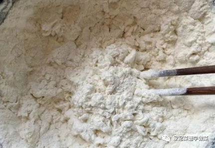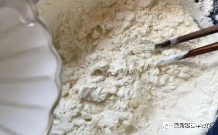 2,再把凉水加入面粉中,同样边加水边用筷子搅拌,把面粉搅拌成大面絮状,如上图所示。
