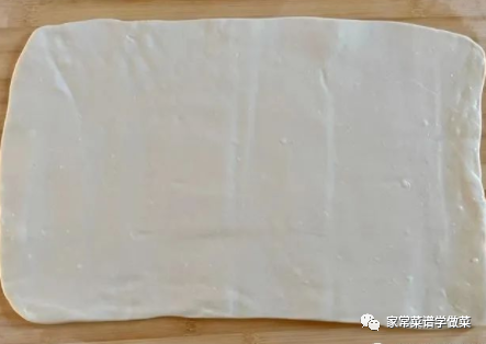 7,取一半的面团,先整理成长条状,再用擀面杖擀成长方形的面片,如上图所示。