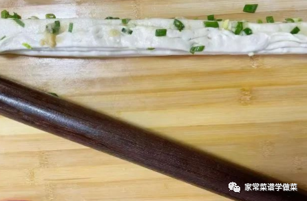 10,接着从一端卷起,卷的时候稍微拽一拽,但是不要太紧了,尾端用擀面杖擀薄一些,再压在饼下面,如上图所示。