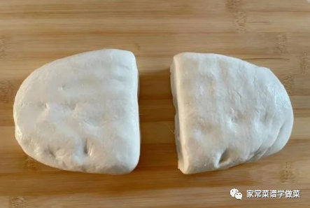 6,面团松弛好了取出,千万不要去揉它,把它放在案板上,直接切分成2半,如上图所示。