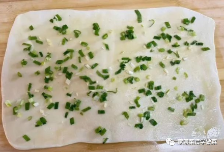 8,接着抹上稀油酥,可以用勺子慢慢抹均匀,也可以用刮板刮均匀,这个方法更方便一些;再撒上适量的葱花,尽量撒均匀一些,如上图所示。