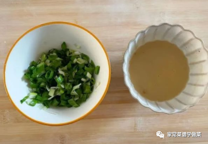 5,接着来调油酥,在小碗中放入40克中筋面粉,一小勺盐搅拌均匀,锅里烧40克玉米油,烧热后浇在面粉上,搅拌均匀调成比较浓稠的稀油酥,喜欢吃五香口味的在油酥中加入适量的五香粉;再把小葱洗净切成葱花备用,如上图所示。