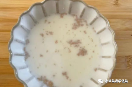 1,在和面团前我们先把干酵母倒入牛奶中,用筷子搅拌一下,再静置5分钟左右,让牛奶与干酵母完全融合,如上图所示。