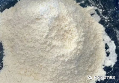 3,戴上手套把猪油与面粉搓均匀,面粉会呈现细小的颗粒状,如果没有猪油这一步也可以省略,成品的口感上略有差别,如上图所示。