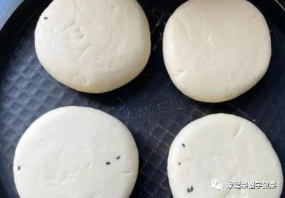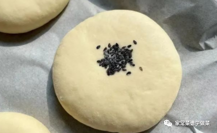 11,收口处朝下放置,压扁,在中间点缀少许芝麻,再用擀面杖轻轻擀成小饼,全部整形完成后密封起来,放在温暖的地方发酵,如上图所示。