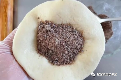 10,压扁后用擀面杖擀成中间厚边缘略薄的面片,放入红糖馅,像包包子一样把口收紧,如上图所示。