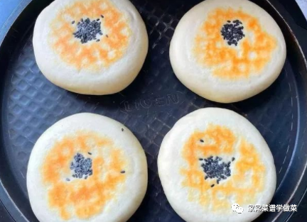 14,烙至小饼鼓起,一面变得金黄后将其翻个面,继续盖上盖子烙,如上图所示。