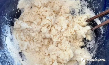 4,做完这些准备牛奶与酵母也融合好了,再将酵母溶液慢慢倒入面粉中,边倒边用筷子搅拌成大面絮状,如上图所示。